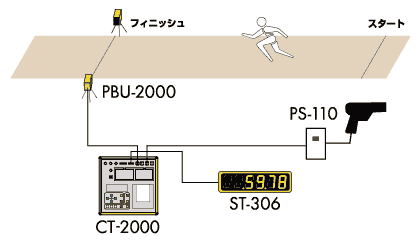 ・トラック競技におけるフィニッシュタイム・ラップタイム・スプリットタイムを計測。 投光器、受光器間の光軸が遮断された瞬間を電気信号に変え計時機器に送信します。